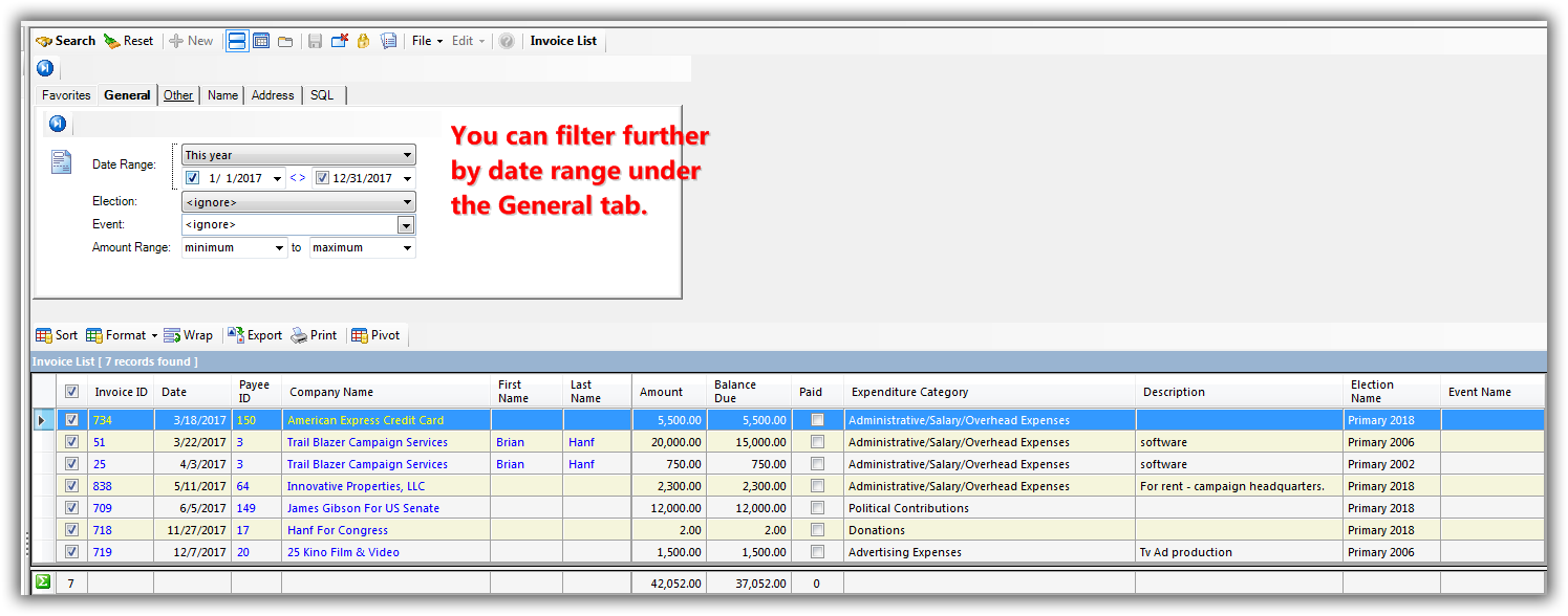 You can filter by things like date range under the General tab.  In this example I filtered for unpaid invoices in 2017 which produced 7 results.