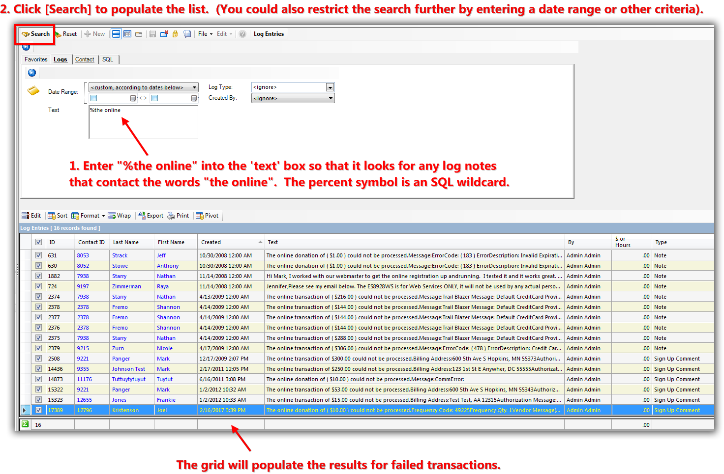 And then click [Search]. The % symbol is an SQL wildcard that will look up all log notes with the words “The online” present. You could of course filter the search further by things like date range, or the specific donor. My example is below which returned 16 log notes with those words present, about 13 were failed transactions.